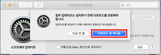 4. 업데이트 설치파일 다운로드 및 재시동에 대한 메세지가 표시됩니다. 다운로드 및 재시동 버튼을 클릭하세요,.