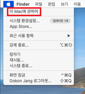 1. 좌측 상단의 사과아이콘을 클릭하고, 이 Mac에 관하여 메뉴를 클릭하세요.