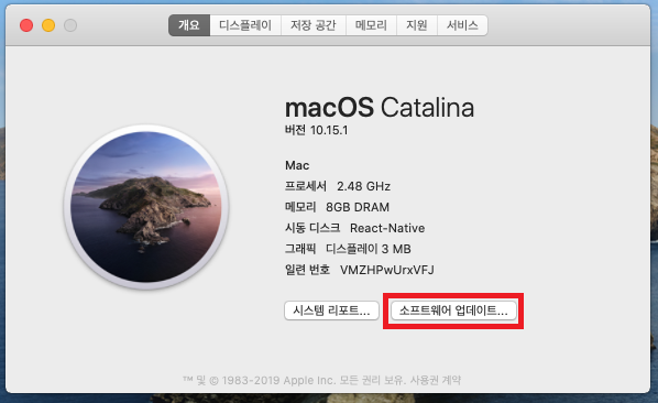 2. mac에 관련된 기본정보 팝업에서 소프트웨어 업데이트... 버튼을 클릭하세요.