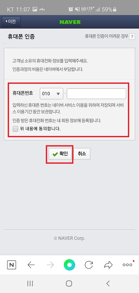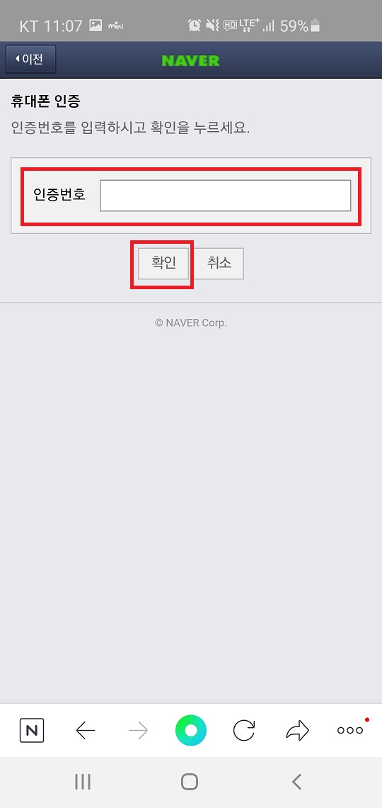 6. 문자로 받은 인증번호를 입력 후 확인을 터치하세요.