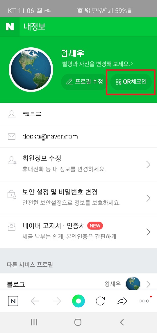 3. 내정보 화면의 우측 상단에 QR 체크인을 터치하세요.