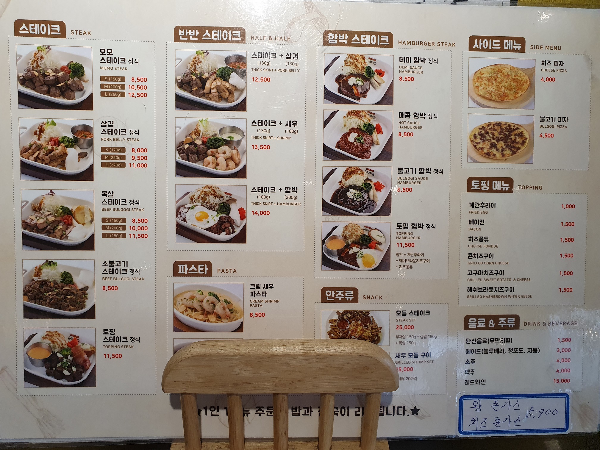 모모 스테이크의 메뉴인데 스테이크과 함박 스테이크 및 파스타로 구성되어있습니다.