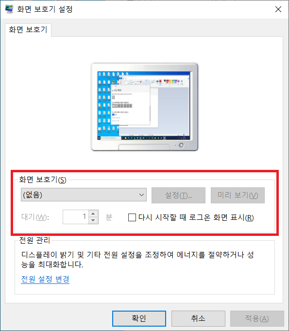※ 화면 보호기를 해제 할 때 로그인 패스워드를 입력하도록 하려면 "다시 시작할 때 로그온 화면 표시"를 체크하세요.