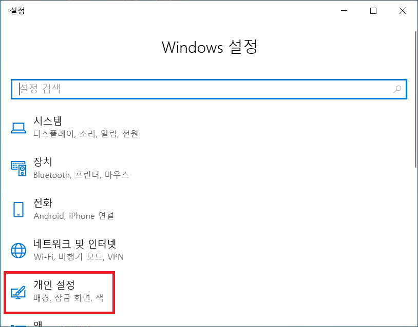 2. Windows 설정 화면에서 개인 설정 메뉴를 클릭합니다.