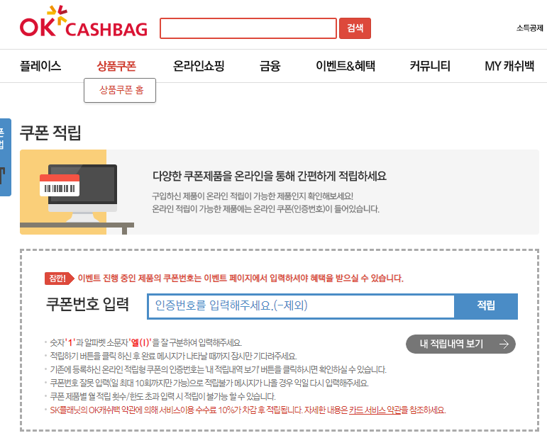 상품쿠폰 화면에서 쿠폰번호 입력에 쿠폰번호를 입력후 적립을 클릭하세요.