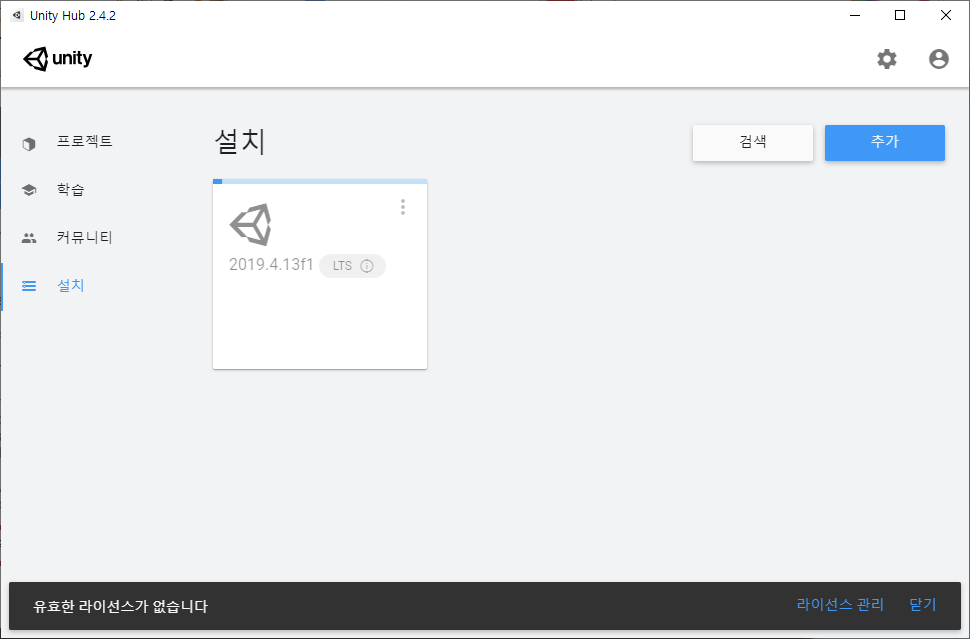 3. 유니티 허브의 좌측 메뉴에서 설치를 클릭합니다.
