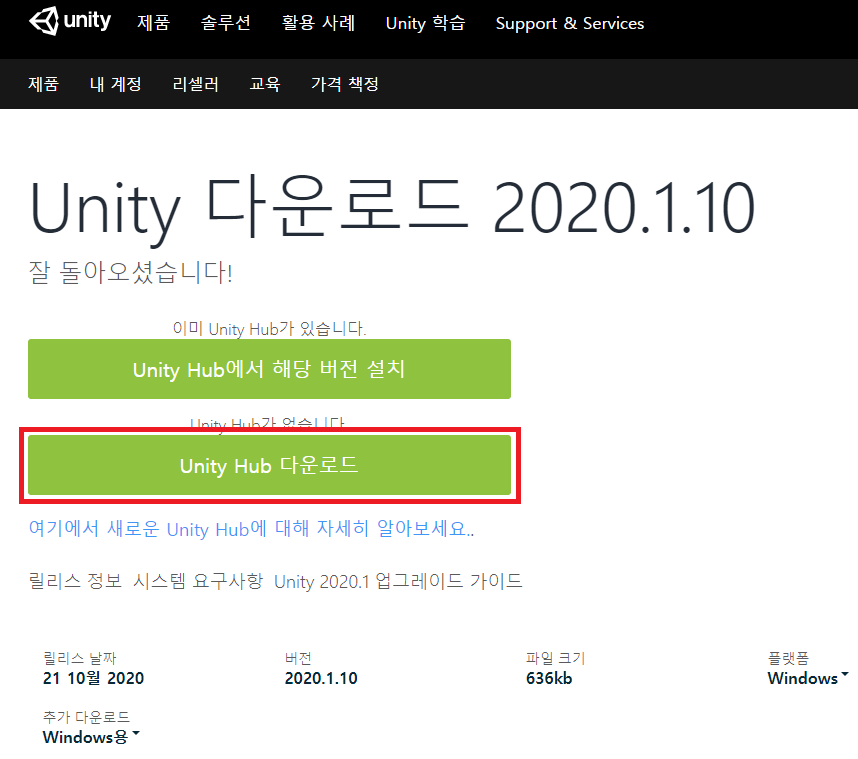유니티를 설치 하려면 유니티 허브를 다운로드 후 설치 해야 합니다.