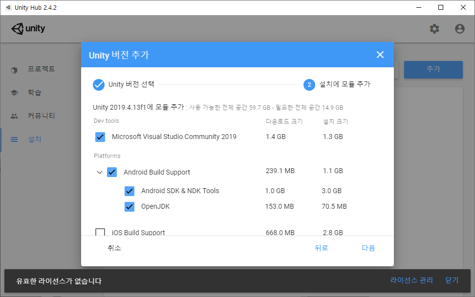 6. 유니티에서 지원 할 플랫폼을 선택하고, 목록 제일 하단의 언어에 한국어를 선택 후 다음을 클릭합니다.