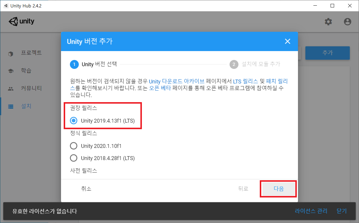 5. 유니티 버전을 선택 후 다음 버튼을 클릭합니다.