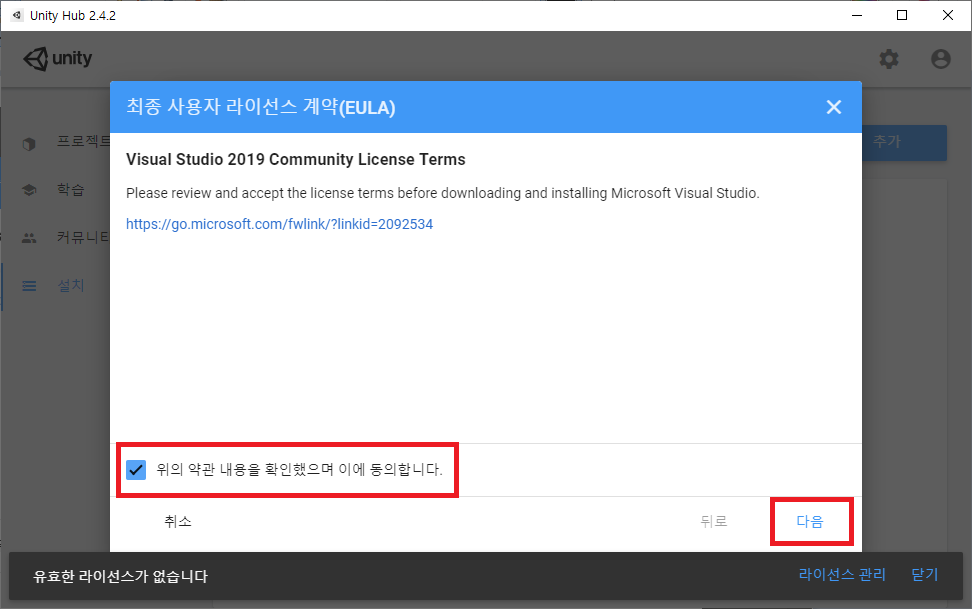 7. 라이센스를 동의 하고 다음 버튼을 클릭합니다.