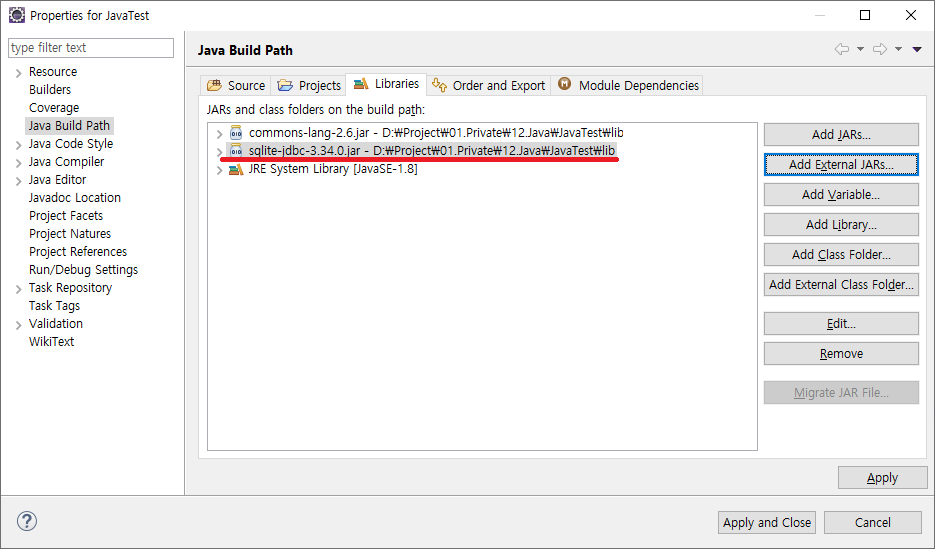 (2) Java Build Path의 Libraries에 Jar파일을 추가합니다.