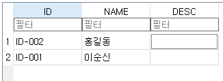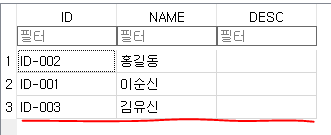values('ID-001', '이순신', '테스트')