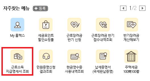 2. 홈택스 좌측 하단부에 자주찾는 메뉴에서 근로소득 지급명세서 조회를 클릭하세요.