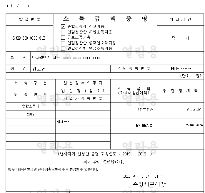 자영업자의 경우는 국세청에서 발급하는 소득금액증명원을 소득증빙자료가 사용됩니다.