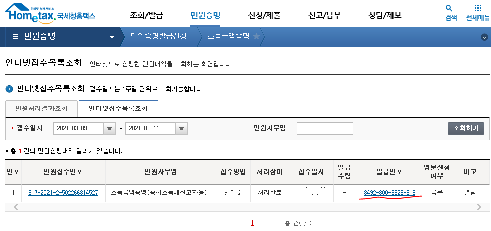 3. 인터넷 접수 목록에서 발급번호를 클릭합니다.