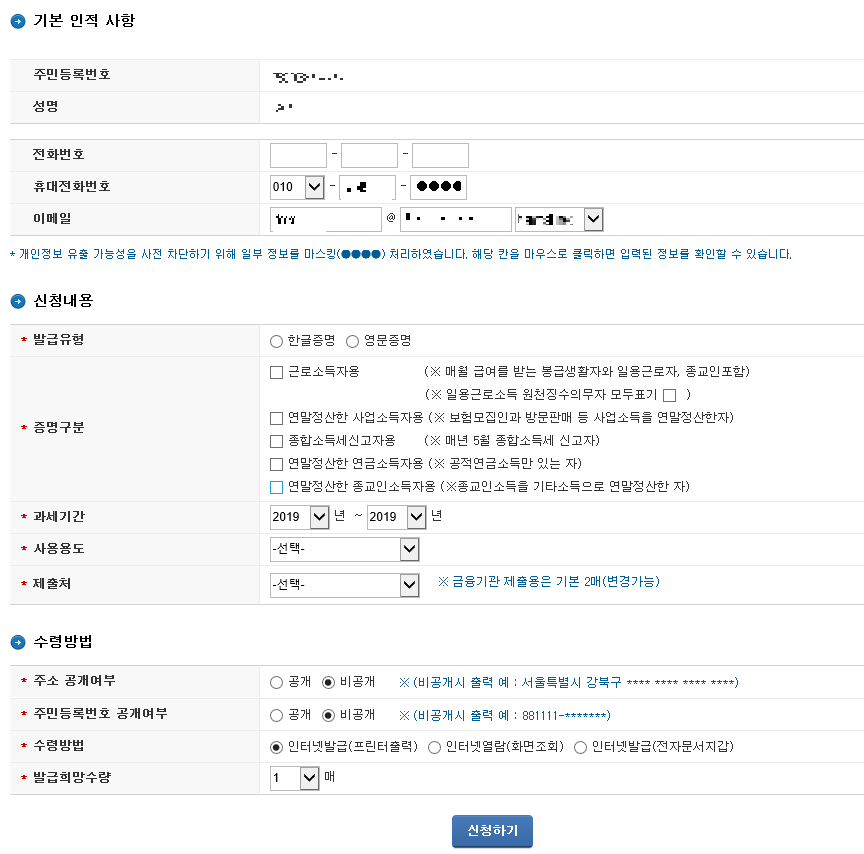 2. 소득금액증명신청서를 작성 후 신청하기 버튼을 클릭합니다.