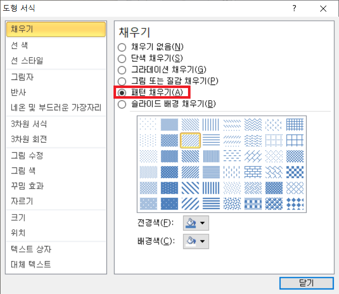 2. 도형 서식의 채우기에서 패턴 채우기를 선택하고 해칭(패턴)을 선택합니다.