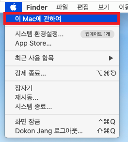 1. 좌측 상단의 사과아이콘 > 이 Mac에 관하여를 클릭합니다.