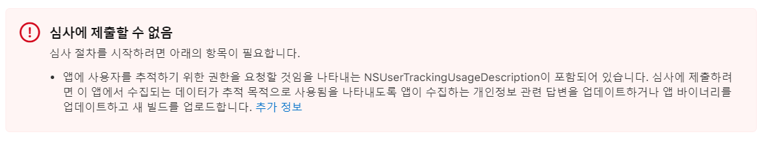 ※ iOS 앱을 심사신청하면 아래와 같이 NSUserTrackingUsageDescription 추가로 앱이 수집하는 개인정보를 수정한다.