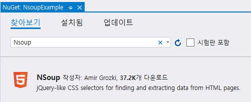 - C# 프로젝트의 NuGet에서 NSoup을 설치하세요.
