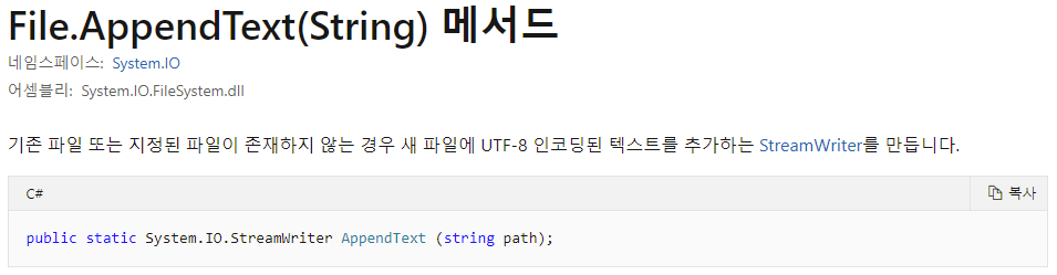 https://docs.microsoft.com/ko-kr/dotnet/api/system.io.file.appendalltext?view=net-5.0