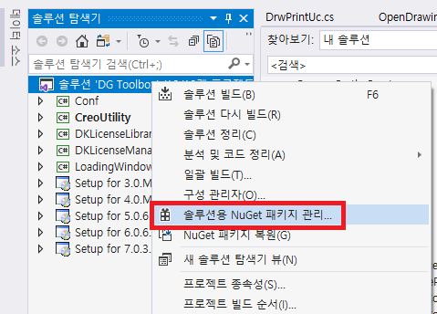 1. 솔류션에서 솔류선용 NuGet 패키지 관리 메뉴를 클릭합니다.