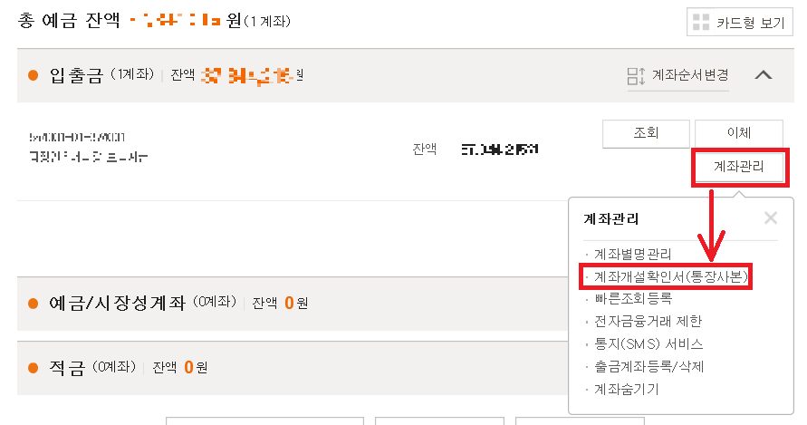 3. 계좌관리 > 계좌개설확인서(통장사본) 메뉴를 클릭합니다.