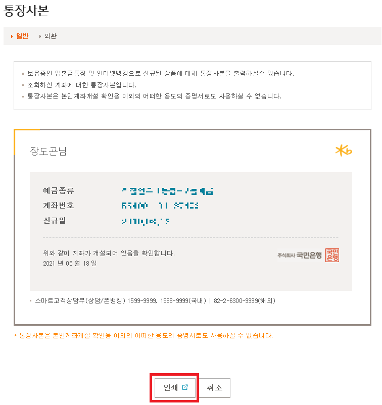 4. 통장사본 화면의 하단의 인쇄를 클릭하면 통장사본을 인쇄 할 수 있습니다.