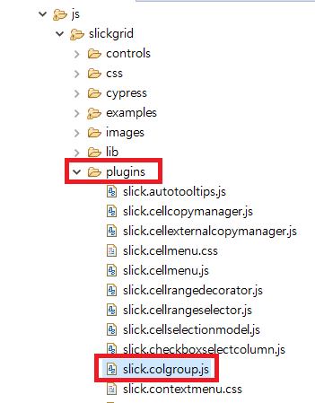 1. 아래의 URL에서 slick.colgroup.js 소스를 Slickgrid 폴더의 plugins에 생성합니다.