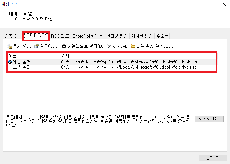 3. 계정 설정 화면의 데이터파일 탭을 클릭하면 데이터파일(pst)의 위치를 확인 할 수 있습니다.