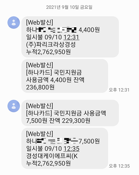 카드사에서 친절하게 재난지원금 잔액을 문자로 보내줬네요.