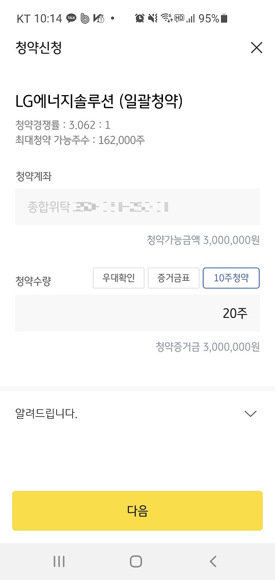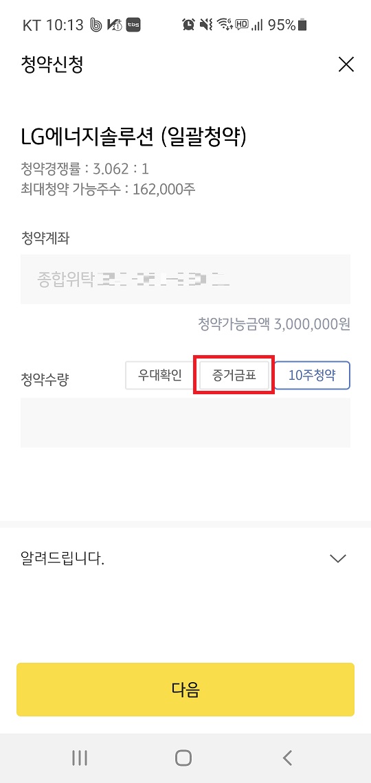 10. 청약수량을 정확히 선택했으면 화면 하단의 다음 버튼을 터치합니다.
