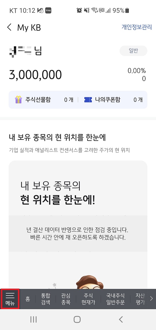 1. 20주를 청약하기 위해서 3백만원을 준비했고, KB증권앱(MTS) 화면 하단의 메뉴를 터치합니다.