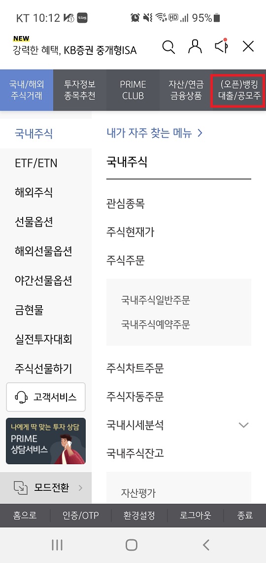 2. 상단의 (오픈)뱅킹 대충/공모주 메뉴를 터치합니다.