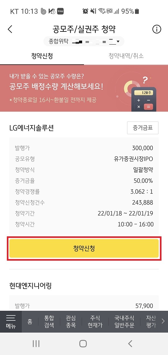7. 청약신청에서 LG에너지솔류션의 청약신청 버튼을 터치합니다.