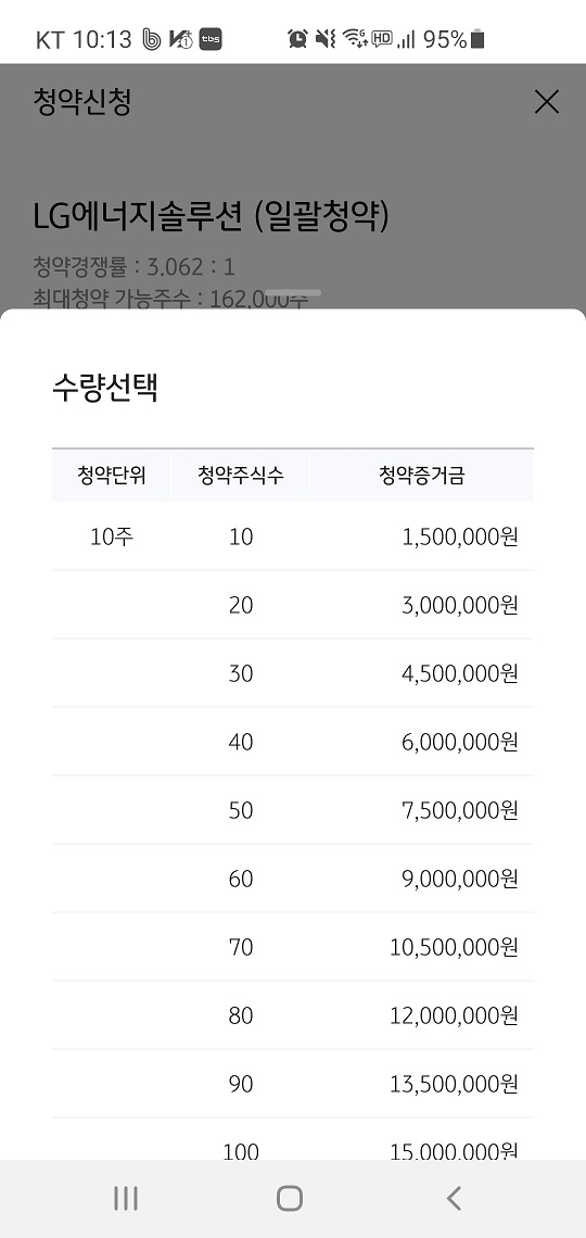 8. 증거금표 버튼을 터치하여 청약 할 주를 선택합니다.