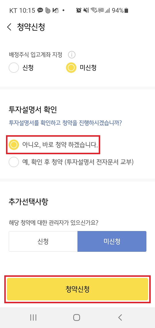 12. 투자설명서 확인을 선택 후 청약신청 버튼을 터치합니다.