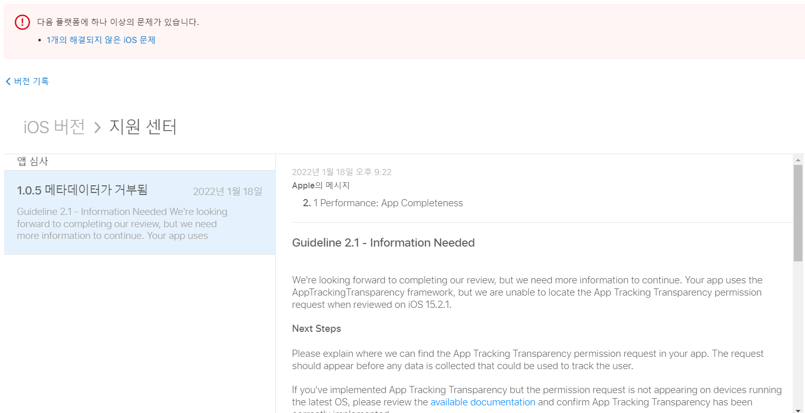 요약해보면 iOS 15.2.1에서 앱 추적 투명성 승인여부 다이얼로그가 표시가 안되기 때문에 리젝되었습니다.