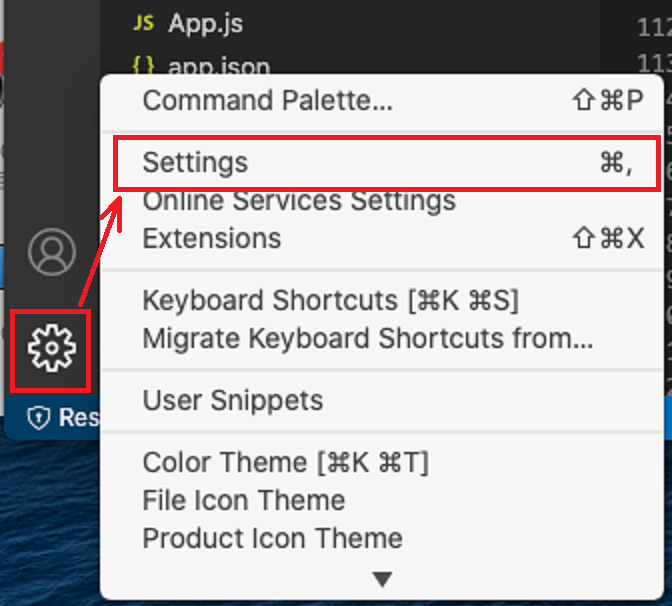 1. VS Code 의 외쪽 하단의 톱니바퀴 아이콘을 클릭하고, 팝업 메뉴의 Settings를 클릭합니다.