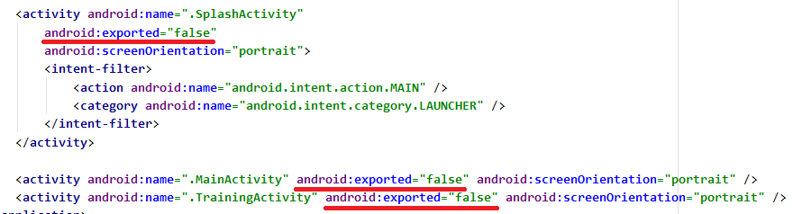 AndroidManifest.xml의 activity에 android:exported를 적용한 예입니다.