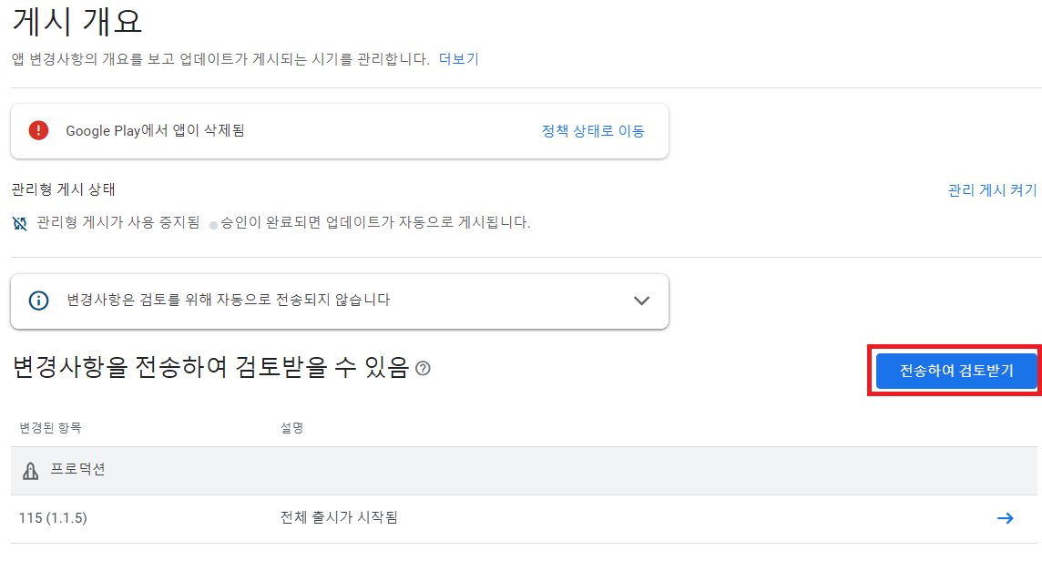 4. 게시 개요 화면에서 업데이트한 앱에 대해서 전송하여 검토받기 버튼을 클릭하여 검토를 받습니다.