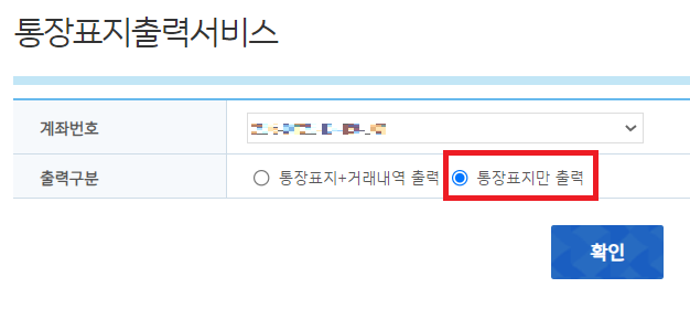 3. 통장표지를 출력할 계좌를 선택 후 통장표지만 출력을 선택 후 확인 버튼을 클릭합니다.
