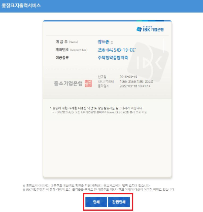 4. 통장표지출력서비스 화면의 인쇄 또는 간편인쇄 버튼을 클릭하여 통장사본을 출력하세요.