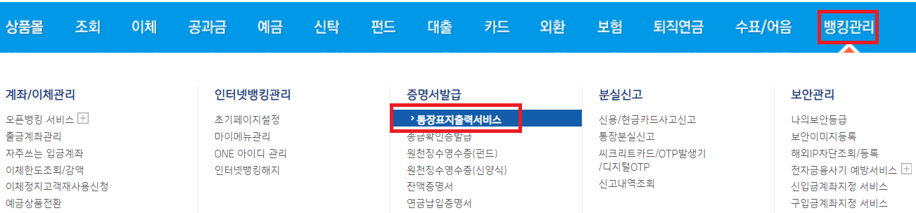 2. 기업은행 홈페이지 상단메뉴의 뱅킹관리 > 통장표지출력서비스를 클릭합니다.