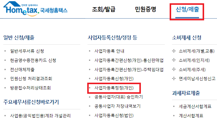 1. 홈택스 메뉴에서 신청/제출 > 사업자등록정정을 클릭합니다.