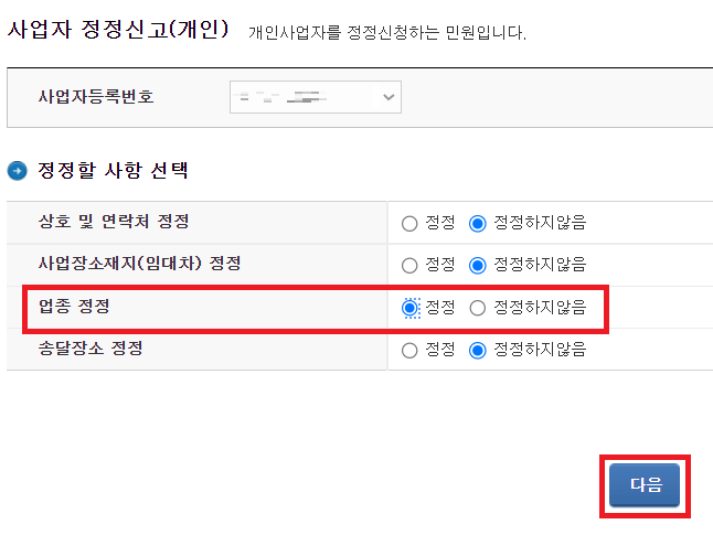 3. 정정할 사항을 업종 정정을 선택 후 다음 버튼을 클릭합니다.