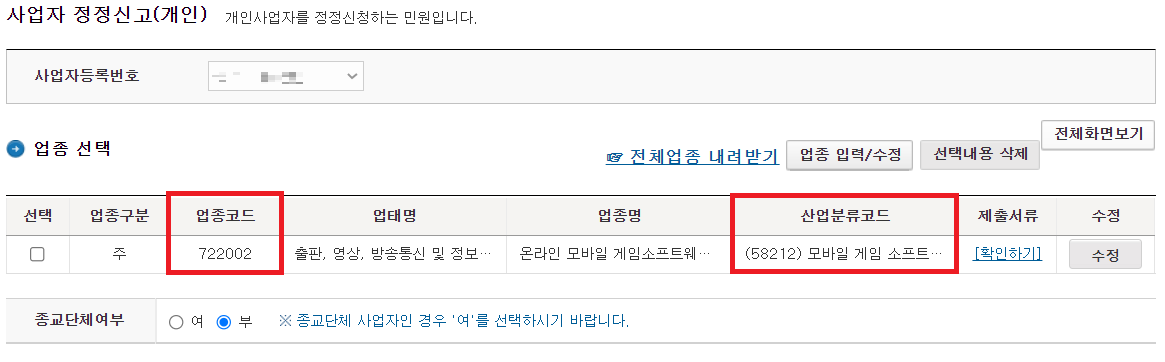 4. 아래와 같이 사업자등록증의 업종코드 및 산업분류코드를 확인 할 수 있습니다.