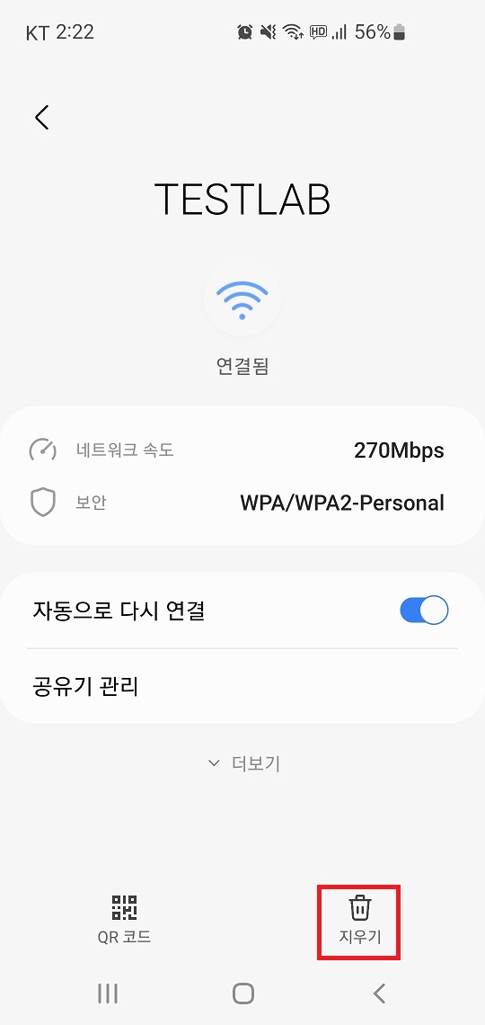 원인은 여러가지가 있지만, 간단히 한번 시도해 볼 만한 방법으로 핸드폰의 와이파이 연결을 삭제하고, 다시 와이파이를 연결하면 해결되는 경우가 있습니다.