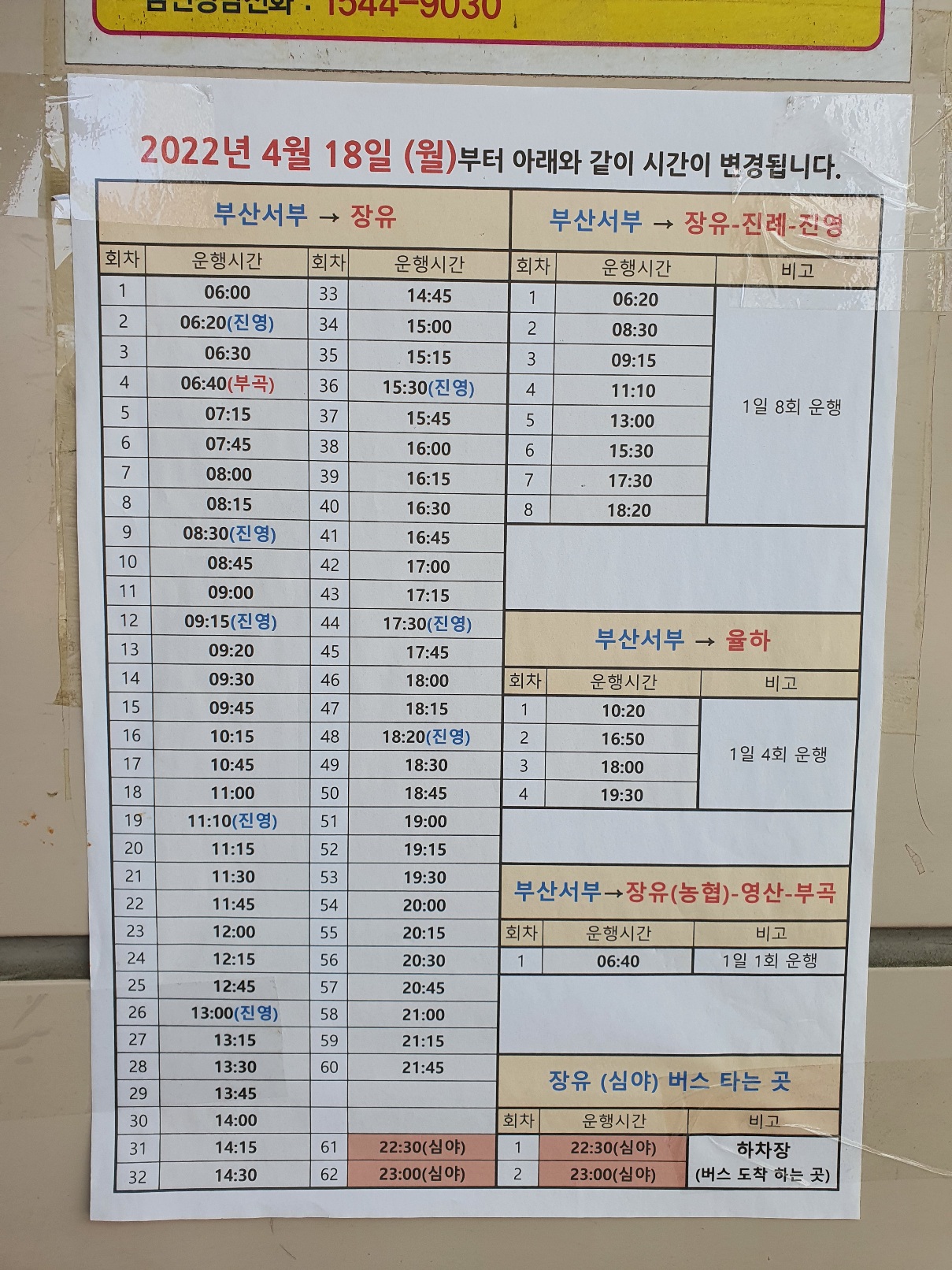 2022년 4월15일부터 부산 사상터미널에서 장유,진례,진영,율하 시외버스 시간이 변경되었습니다.