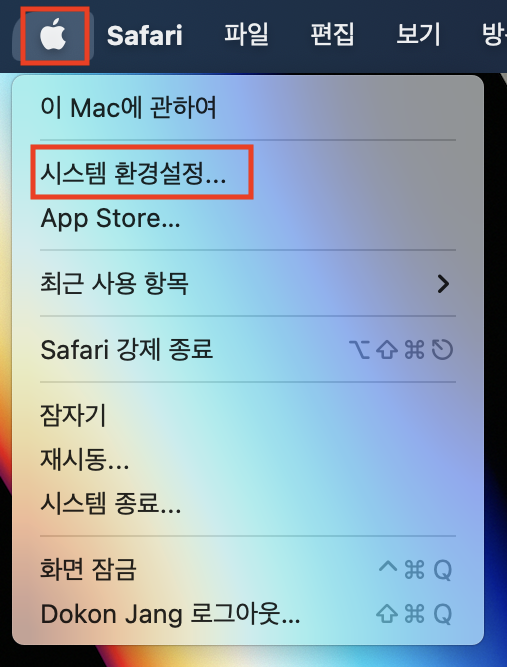 1. 맥OS 화면의 좌측 상단의 사과 > 시스템 설정을 클릭합니다.